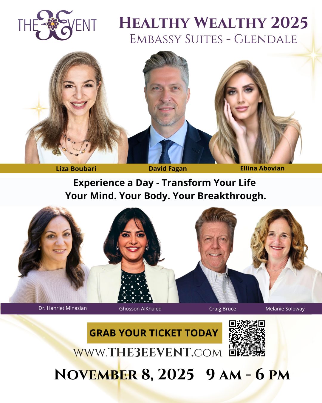 GLENDALE, CA, UNITED STATES, October 23, 2025 /EINPresswire.com/ -- Liza Boubari, founder and host of The 3E Event, is thrilled to announce the dynamic speaker lineup and transformative experiences ahead for attendees at Healthy Wealthy 2025: Where Healing Meets Prosperity, happening November 8, 2025, from 9:00 AM to 6:00 PM PST, at Embassy Suites, Glendale in Los Angeles. — Liza Boubari, clinical hypnotherapist, founder The 3E Event