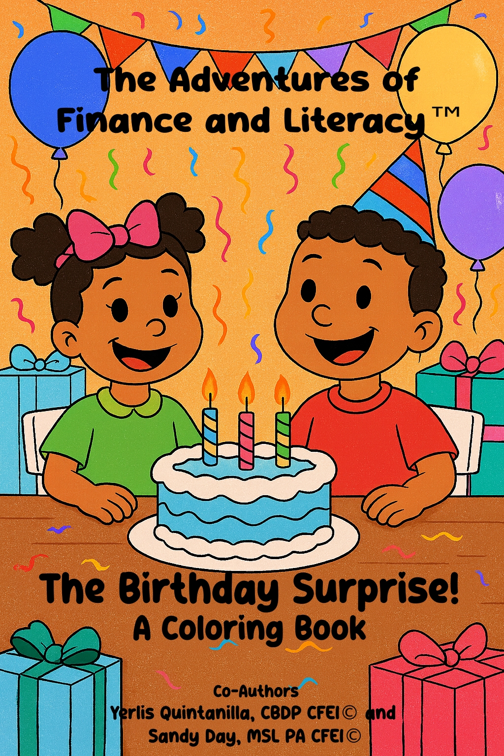 WASHINGTON, DC, UNITED STATES, October 16, 2025 /EINPresswire.com/ -- At a time when financial literacy is as essential as reading and math, bestselling author and certified financial educators Sandy Day and Yerlis Quintanilla are rewriting the story of how kids learn about money. Today, Day and Quintanilla officially launch The Adventures of Finance and Literacy™, Vol. 1: The Birthday Surprise—a first-of-its-kind children’s coloring book that turns money lessons into exciting adventures for kids ages 5–9.
