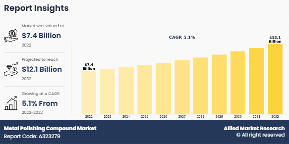 WILMINGTON, DE, UNITED STATES, October 10, 2025 /EINPresswire.com/ -- Allied Market Research has recently published a report, titled, “Metal Polishing Compound Market Size, Share, Competitive Landscape and Trend Analysis Report by Type, by End-use : Global Opportunity Analysis and Industry Forecast, 2023-2032.” According to the report, the global metal polishing compound market generated $7.4 billion in 2022, and is anticipated to generate $12.1 billion by 2032, rising at a CAGR of 5.1% from 2023 to 2032.