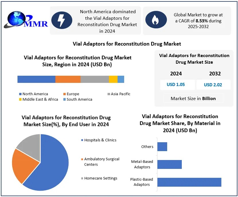 WILMINGTON, DE, UNITED STATES, October 10, 2025 /EINPresswire.com/ -- Global Vial Adaptors for Reconstitution Drug Market Size was valued at USD 1.05 Billion in 2024 and is projected to reach USD 2.02 Billion by 2032, growing at a strong CAGR of 8.53% during the forecast period (2025โ€“2032).